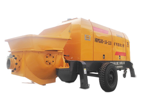 科达HBMG60型矿用混凝土输送泵最大理论排量60m³/h,主电机功率75KW,最大理论输送距离水平600m/垂直120m,允许最大骨料粒径40mm,拥有煤安安全标志证书。